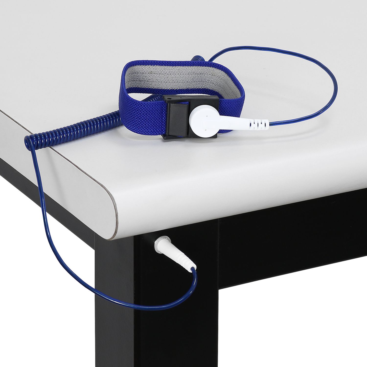 How it works: Exclusive LisStat™ laminate is applied to the top, sides, and is wrapped around the front edge where it extends under the top, and is secured underneath by under lapping the frame members. An exclusive full size sheet of aluminum in applied to the underside, and makes solid contact with all edge laminate, the rolled under front edge and the work bench frame. This makes the entire workbench dissipative at every point.